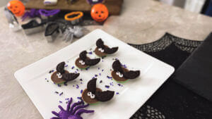 All you need is a Reese’s Franken-Cup, a cookie and frosting – the rest is optional! Using the new half green crème and half milk chocolate Reese’s Cup as the base, cut a small cookie in half to create the bat wings. Frosting will be the “glue” to connect the cookie to the Reese’s Cup, to create wings, and then add small candy eyes. Put a little frosting under each eye to help it stick. Super easy!
